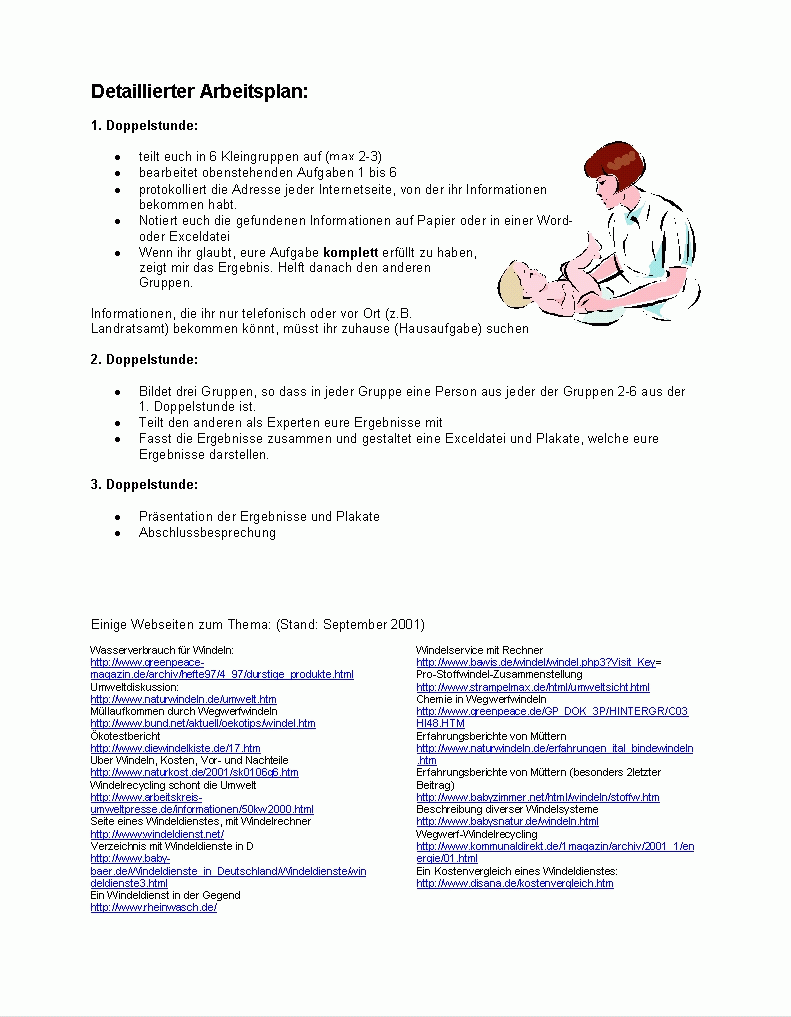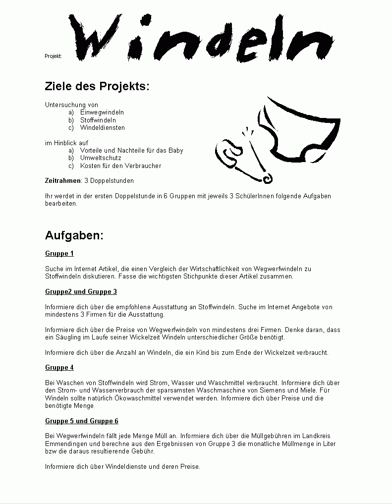 An dieser Stelle noch ein persönlicher Kommentar: Meine Frau und ich wickeln unser Kind immer noch voller Überzeugung mit Stoffwindeln. Dennoch möchte ich mit diesem Artikel nicht den Eindruck erweckt haben, dass Stoffwindeln die Lösung schlechthin sind. Wer keine Lust hat, eingenässte Windeln anzufassen und stinkende Windeln bis zur nächsten Wäsche zu lagern, wer keine Gelegenheit hat, die gewaschenen Windeln zum Trocknen aufzuhängen, und wer einfach nicht die Zeit hat, den Mehraufwand auf sich zu nehmen, für den sind Wegwerfwindeln einfach praktisch und stehen nicht zur Debatte (Ebenso wurden kostenintensive Trockenverfahren wie Bügeln oder ein Wäschetrockner nicht in die Berechnung und Diskussion einbezogen). Für den Rest ist es ein Anstoß zum Nachdenken über die Wegwerfgesellschaft und die Errungenschaften der Materialforschung. Und solche Anstöße zu geben, gehört sicherlich auch zu den Aufgaben der Schule.