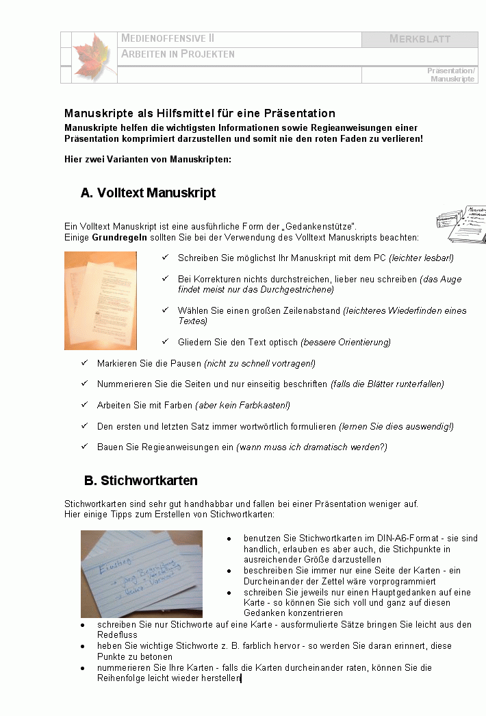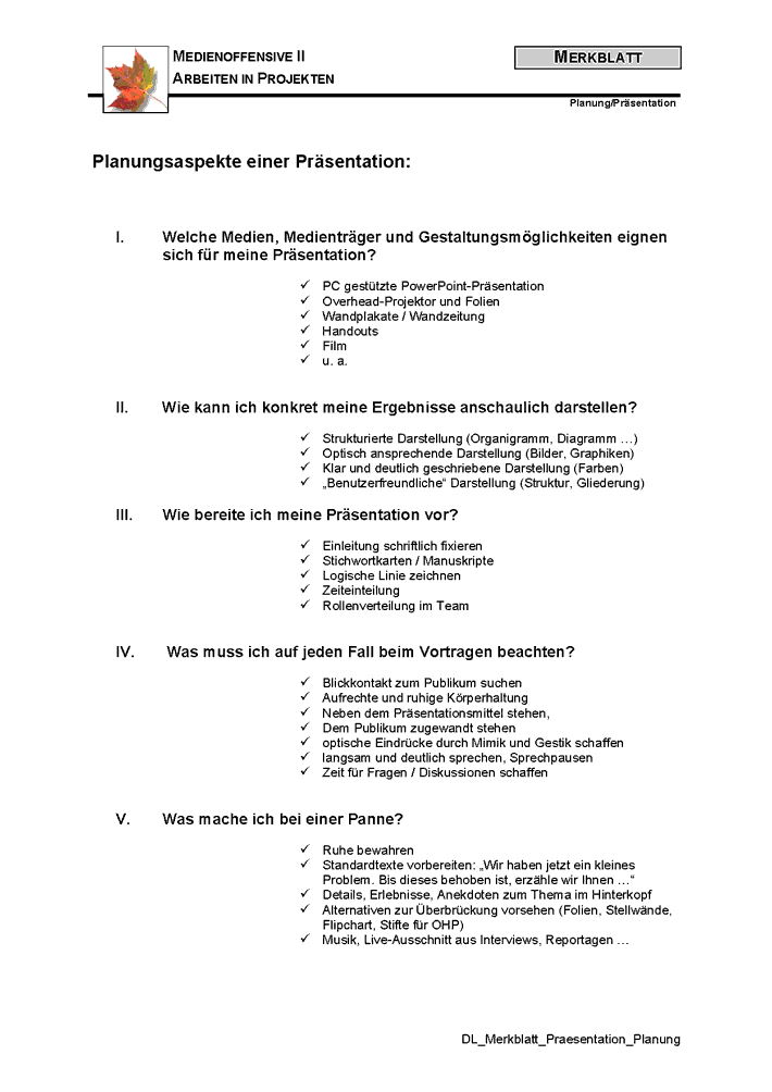 Zur Planung einer Präsentation können Sie das vorliegende Merkblatt verwenden: