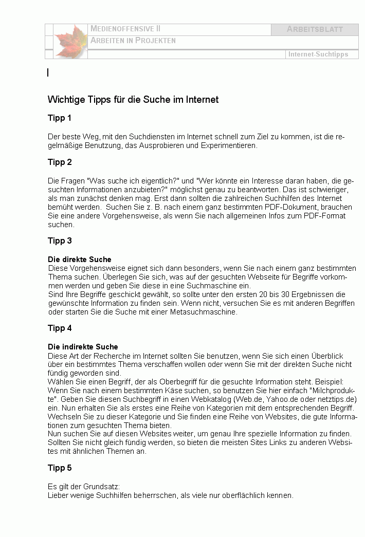 Arbeitsblatt mit Zusammenfassungen von Tipps