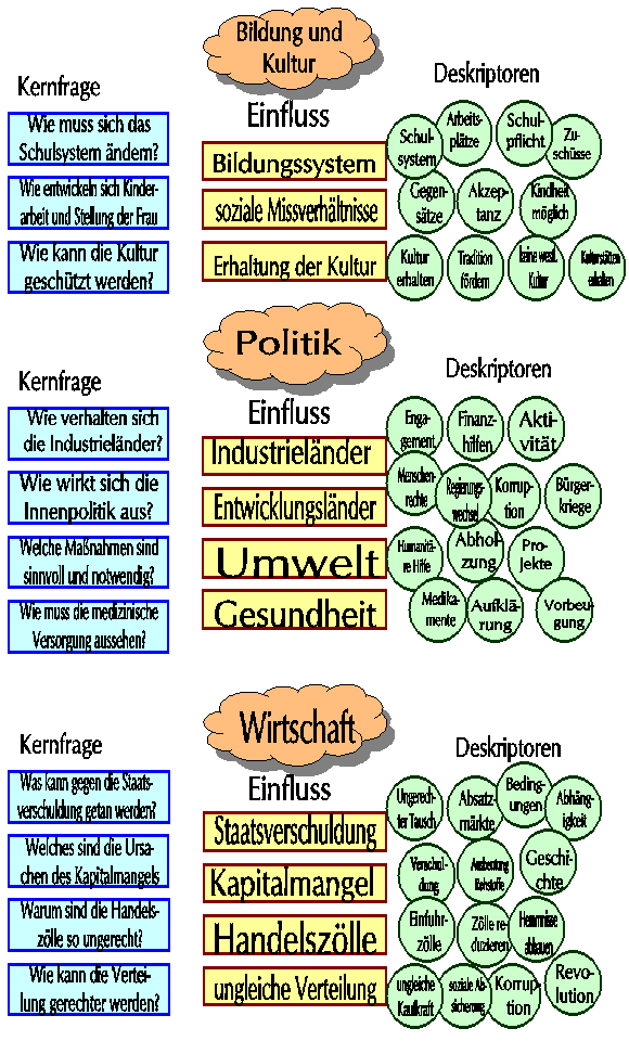 Jetzt geht es darum, Einflussbereiche und Einflussfaktoren ausfindig zu machen, die auf das zu untersuchende Problemfeld unmittelbar einwirken. Dabei helfen Informationsfragen (= Fragen an die Zukunft): Was müssen wir für jeden Faktor wissen, um die zukünftige Entwicklungspolitik beschreiben zu können? Durch welche Kerngrößen bzw. Messziffern (Deskriptoren) lassen sich die jeweiligen Informationsfragen beantworten? Zu jeder Informationsfrage muss mindestens ein Deskriptor formuliert werden, dabei sollte die Unterscheidung von quantitativen und qualitativen Deskriptoren strikt beachtet werden. Alle Deskriptoren müssen eine Ausprägung ermöglichen (mehr – weniger, besser – schlechter). Es müssen unbedingt auch qualitative Deskriptoren formuliert werden (z. B. gesellschaftliche Akzeptanz der Entwicklungspolitik - positiv / negativ).