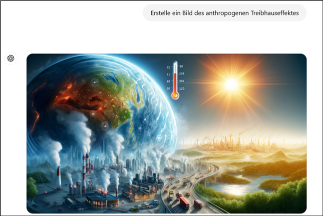 Nachdem alle Lernenden den anthropogenen Treibhauseffekt im Unterricht erarbeitet haben, bietet diese offene Art der Aufgabe eine Leistungsdifferenzierung, indem alle Lernenden in ihrer Verständnistiefe das von der KI generierte Bild auf die fachliche Richtigkeit hin überprüfen.