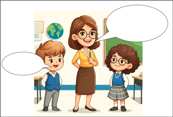 Quelle: S. Kirsch, Hintergrundbild kreiert mit DALL·E 2024-04-21 (Create a cartoon: a friendly teacher discusses with two students in a classroom with a world map.)