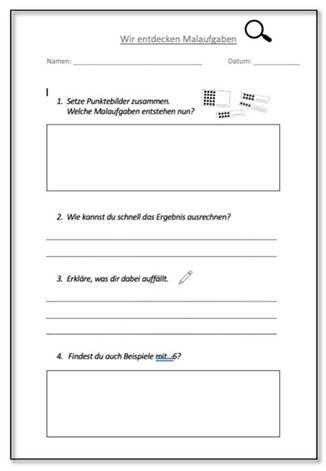Gemeinsam wird geklärt, wie die Malaufgaben zu den Punktebildern heißen. Weiterarbeit in Partnerarbeit möglich. Um vielfältige Entdeckungen machen zu können, müssen die Lernenden die Rechteck-Punktefelder je zweimal erhalten.