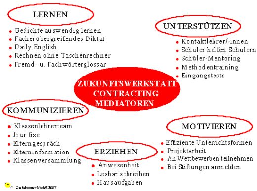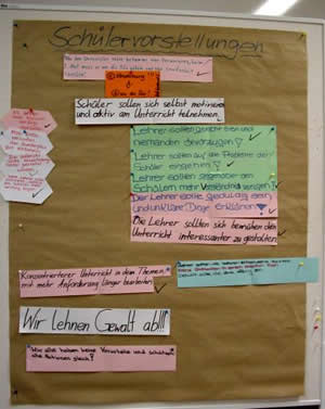 Dabei ist es wichtig, darauf zu achten, dass die Regeln der Moderation eingehalten werden: Es wird groß und deutlich geschrieben, auf jeder Karte ist lediglich ein Sachverhalt einzutragen. Reihum tragen Schüler/-innen jeweils eine Karte vor, erläutern sie und legen sie in der Mitte ab. Dies wird solange wiederholt, bis alle Karten auf dem Boden liegen. Die Beiträge werden abgeglichen und geclustert. Die Schüler ordnen sich jeweils einem der fünf bis sieben Cluster zu und haben in der nun folgenden Phantasiephase die Möglichkeit, die in der Kritikphase aufgedeckten Probleme, Schwierigkeiten, Ängste und Befürchtungen ins Positive zu wenden. Sie erarbeiten in Gruppen Lösungsvorschläge, formulieren diese aus, diskutieren sie in der Klasse und arbeiten anschließend die Verbesserungsvorschläge der Mitschüler/-innen ein. Das Ergebnis ist die Basis für den mit den Lehrenden auszuhandelnden Vertrag. |