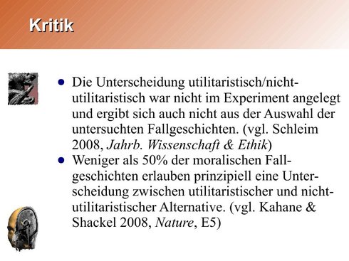 - Die Unterscheidung utilitaristisch/nicht-utilitaristisch war nicht im Experiment angelegt und ergibt sich auch nicht aus der Auswahl der untersuchten Fallgeschichten, (vgl. Schleim 2008, Jahrb. Wissenschaft & Ethik)