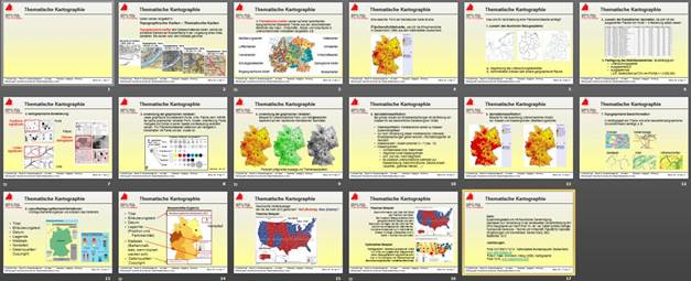Theoretische Einführung in die thematische Karte; Übersicht über bekannte Formen der thematischen Karte; Beispiel für die Wirkung unterschiedlicher Farb- und Helligkeitsstufen basierend auf den identischen thematischen Sachdaten; Übersicht über graphische Grundelemente Beispielhaftes Ergebnis einer korrekt und vollständigen thematischen Karte; falsches Beispiel einer Karte zur Präsidentenwahl USA 2012 sowie die Darstellung deren optimierten Ausführung; Folienpräsentation der Hochschule Karlsruhe, Geomatik.