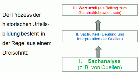 Aus didaktischen Gründen ebenso geboten ist es, mit der Dekonstruktion unterschiedlicher Sach- und Werturteile etwa in zeitgenössischen oder aktuellen Darstellungen zu beginnen, um die Schülerinnen und Schüler für die Komplexität historischer Urteilsbildung, aber auch für die Unterschiede beider Urteilsformen zu sensibilisieren.