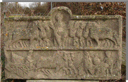 So wie dieses Epona-Relief aus Freiberg am Neckar könnte auch das in Hechingen-Stein ausgesehen haben. Man sieht oben in einer muschelförmigen Nische die Göttin mit einem Futterkorb für die Pferde thronen.