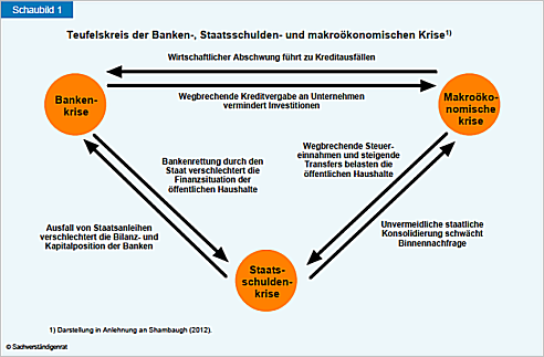 (C) Schaubild: Teufelskreis der Banken-, Staatsschulden- und makroökonomischen Krise, in: Sachverständigenrat zur Begutachtung der gesamtwirtschafllichen Entwicklung (2012): Nach dem EU-Gipfel: Zeit für langfristige Lösungen nutzen. Sondergutachten. Wiesbaden 05.07.2012. S. 1.