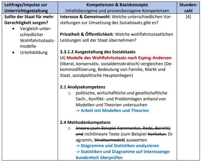 - Bewertung der unterschiedlichen Wohlfahrtsstaatsmodelle (Berücksichtigung unterschiedlicher Perspektiven: Generation in Ausbildung, Berufstätige, heutige Rentner; Anwenden von Kriterien: z.B. Nachhaltigkeit, Leistungsgerechtigkeit, Bedarfsgerechtigkeit, Generationengerechtigkeit; Beachten der Spannungsverhältnisse wie zum Beispiel Legitimität versus Effizienz, Interesse versus Gemeinwohl)