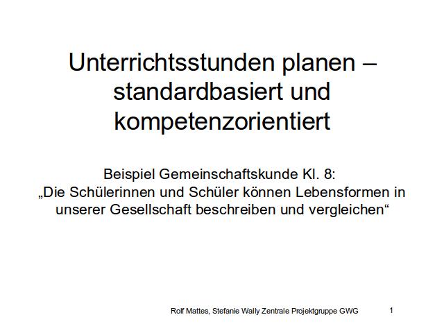 Unterrichtsstunden planen – standardbasiert und kompetenzorientiert Beispiel Gemeinschaftskunde Kl. 8: „Die Schülerinnen und Schüler können Lebensformen in unserer Gesellschaft beschreiben und vergleichen“