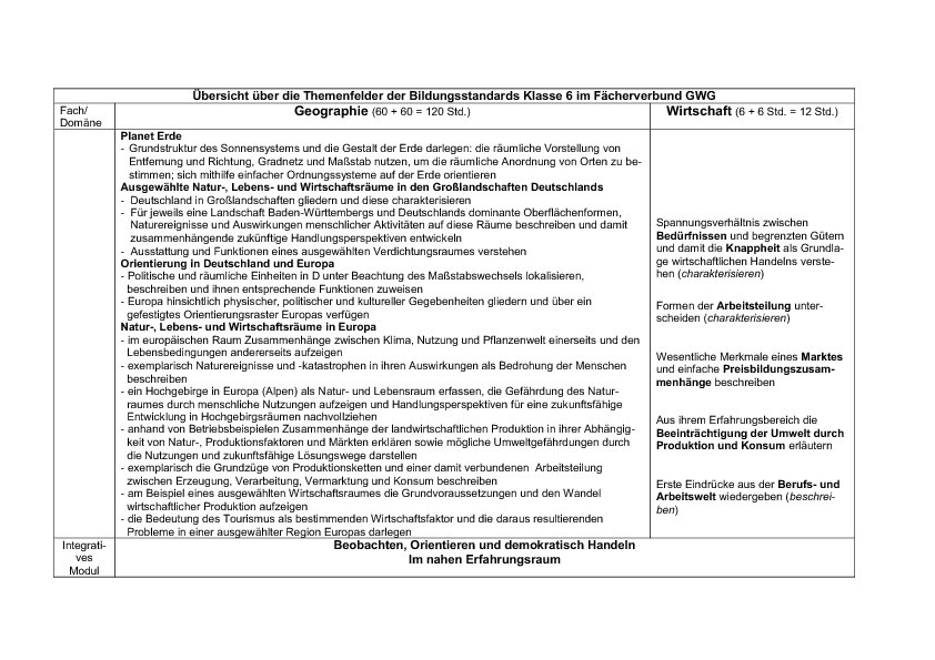 Die nachfolgende Übersicht ermöglicht eine Orientierung über die Themenfelder der Bildungsstandards Klasse 6 im Fächerverbund GWG.
