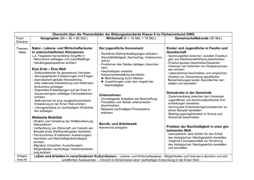 Übersicht über die Themenfelder der Bildungsstandards Klasse 8 im Fächerverbund GWG
