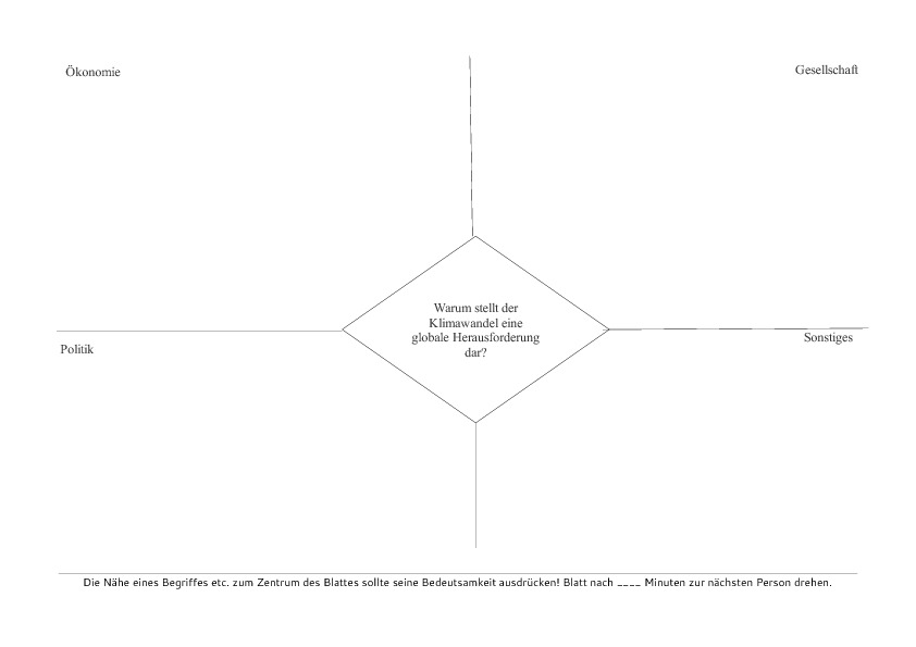 Das Placemat dient zu Beginn der Unterrichtseinheit dazu, das Vorwissen der Schüler abzufragen. Setzen Sie das Placemat am Ende der Unterrichtseinheit erneut ein. Vergleichen Sie die Placemats im Rahmen der Evaluation der Unterrichtseinheit: Eine Zunahme von Komplexität bei den Antworten deutet auf Kompetenzerwerb hin.