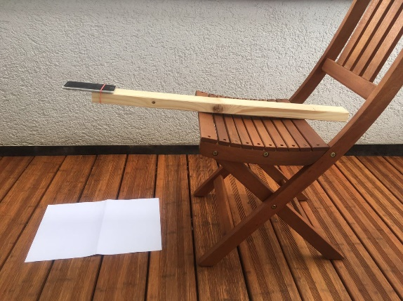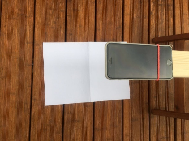 Im Klassenzimmer wird zunächst das allen zugängige Aufnahmestativ gebaut: Schiebt hierzu zwei Tische aneinander und stellt einen Stuhl auf einen der Tische. Ein Handy wird mit der Kamera nach unten mit Gummis an einem langen Stab befestigt. (Vorsicht: Achtet auf eine sichere Befestigung, sodass das Handy nicht herunterfallen kann!) Das Ende des Stabes wird am Stuhl verankert (z.B. zwischen mehrere schwere Bücher gelegt). Unter dem Handy wird ein weißes DIN A2 Blatt (im Notfall tut es auch Din A3) als Hintergrund gelegt. Damit dieser nicht verrutscht, sollte der Hintergrund am Tisch fixiert werden (z.B. mit Poster Stripes oder Tesafilm).
