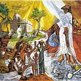 Bildquelle: MISEREOR-Hungertuch aus Indien „Leben – Wasser und Licht“ von Jyoti Sahi © MVG Medienproduktion, 1984 (Ausschnitt) [C]