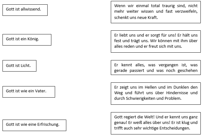 Ordne der jeweiligen „Wortmalerei“, die Gott beschreibt, die passende Erklärung zu, indem du die Kästen miteinander verbindest: