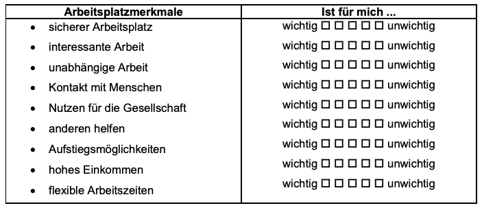 - In M 1a werden einige Erwartungen an die Berufstätigkeit aufgelistet. Markieren Sie, wie wichtig Ihnen die einzelnen Aspekte sind.