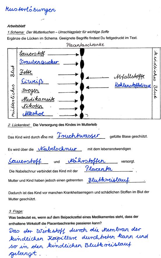 2. Lückentext: Die Versorgung des Kindes im Mutterleib