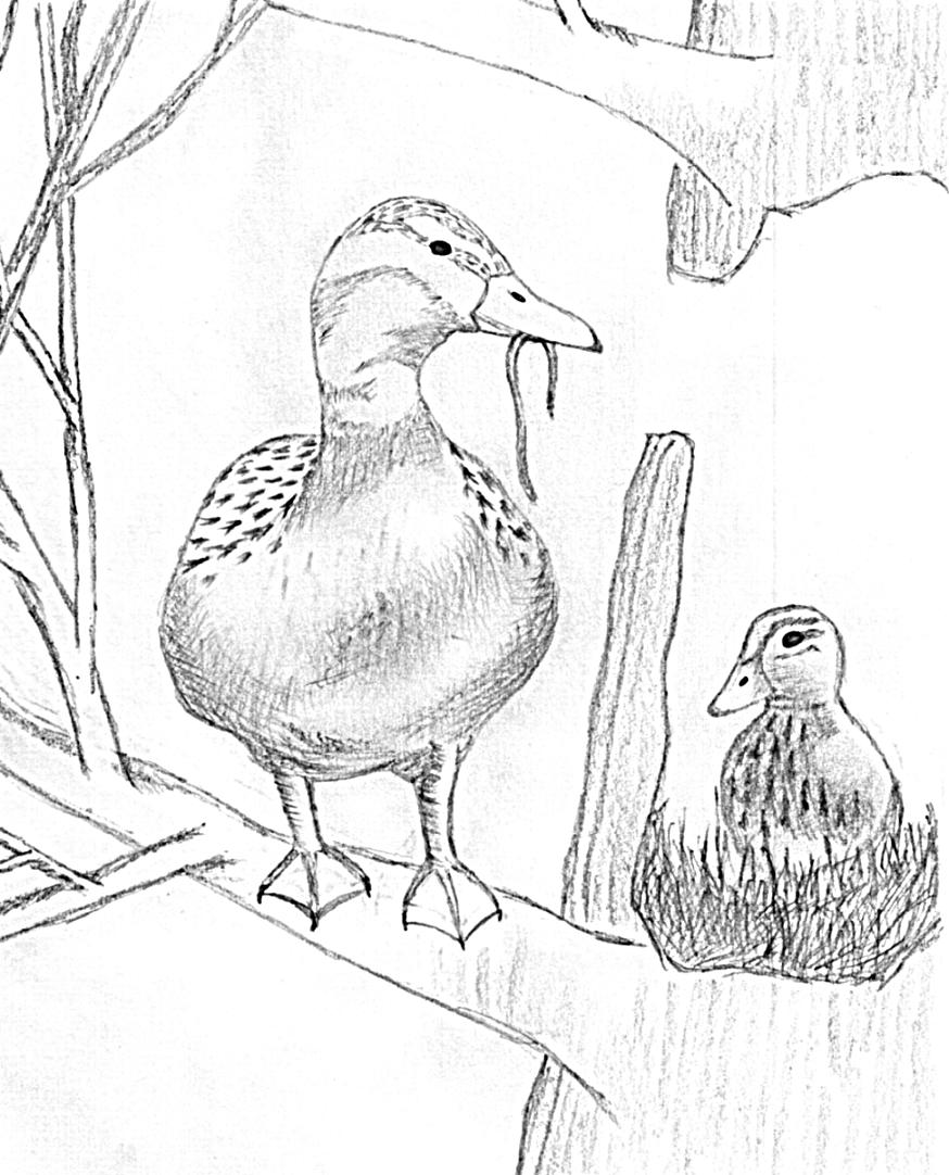 Einstieg/Motivation : Abbildung: Stockente im Baum mit Wurm im Schnabel vor Spechthöhle mit Jungen Was stimmt hier nicht? |