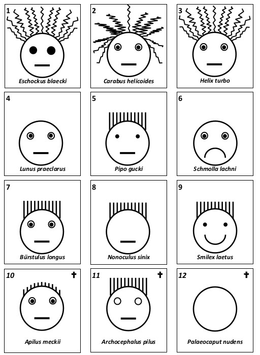 beteiligt war, entdeckte auf diesem Planeten Lebewesen. Es handelt sich um die abgebildeten Mitglieder des Stammes der Kopflinge (Cephalocaputae) mit den Nummern 1 - 9.