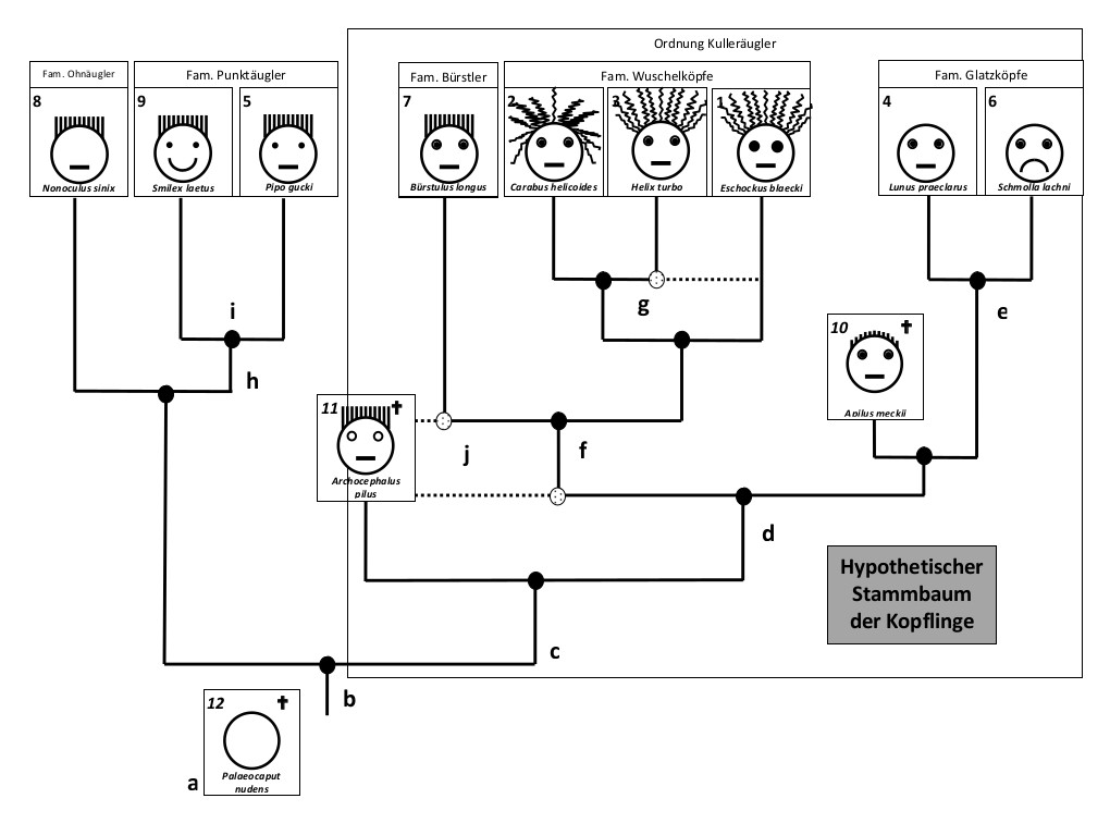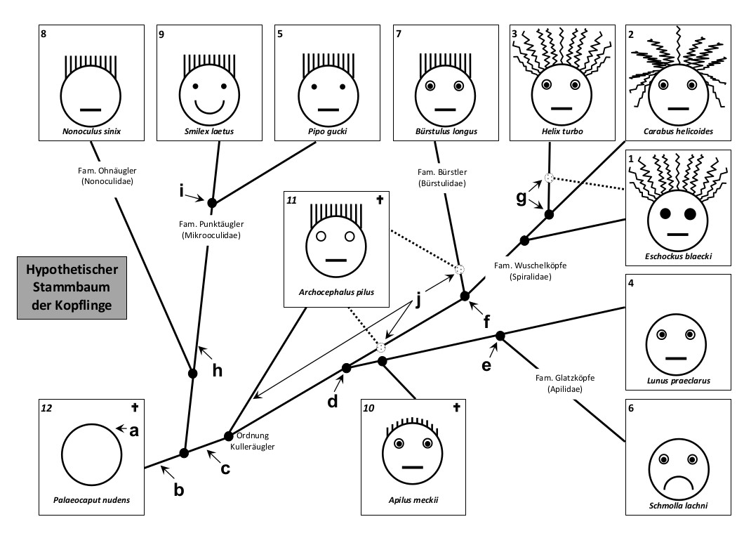 - Erstellen Sie einen hypothetischen Stammbaum der rezenten Kopflinge unter Berücksichtigung ursprünglicher und abgeleiteter Merkmale. Gehen Sie dabei von Palaeocaput nudens als Stammart aus.