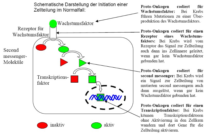 b) Man vergleicht die Funktion zellulärer Proto-Onkogene gerne mit dem Gaspedal eines Autos. Stellen Sie in einem Schema einer Zelle übersichtlich dar, auf welchen Ebenen die Zellzyklus-Kontrolle mutationsbedingt versagen kann (d.h. das Gaspedal klemmt in gedrücktem Zustand).