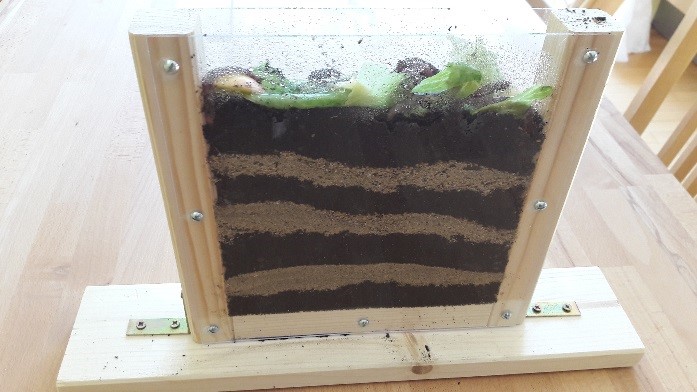 4. Den Kasten abwechselnd mit Gartenerde und Sand befüllen; auf die oberste Schicht einige Bioabfälle (Salat, Schalen...) geben. Danach die Erde von oben mit Hilfe eines Pflanzensprühers befeuchten.