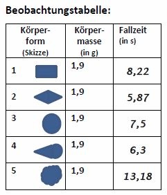 Folgerung und Erklärung: Der Körper mit der Tropfenform legt die Strecke am schnellsten zurück. Man nennt diese Form auch Stromlinienform (stromlinienförmig). Die Hypothese wurde bestätigt.