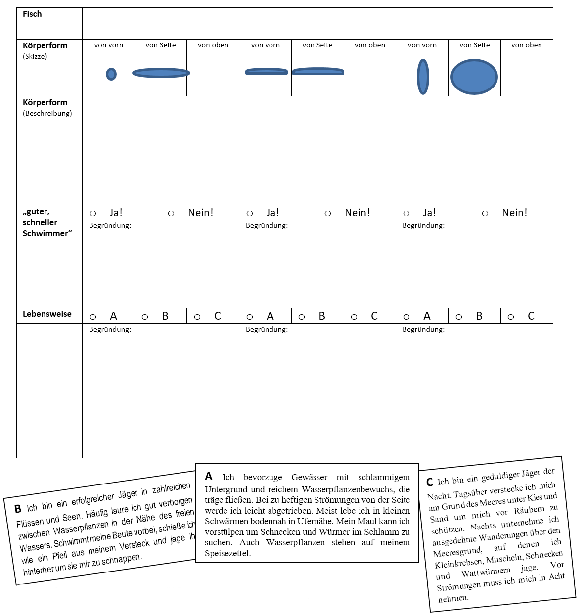 - Ordne die Beschreibung der Lebensweise zu. Begründe mit Hilfe der Körperform.