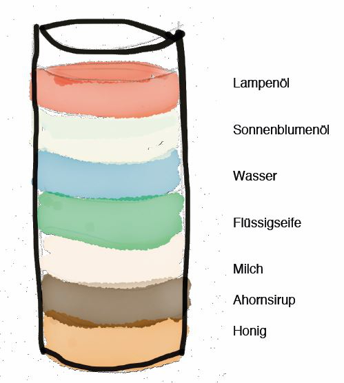 Zum Weiterdenken: Ein Glas ist mit verschiedenen Flüssigkeiten gefüllt. Erklärt