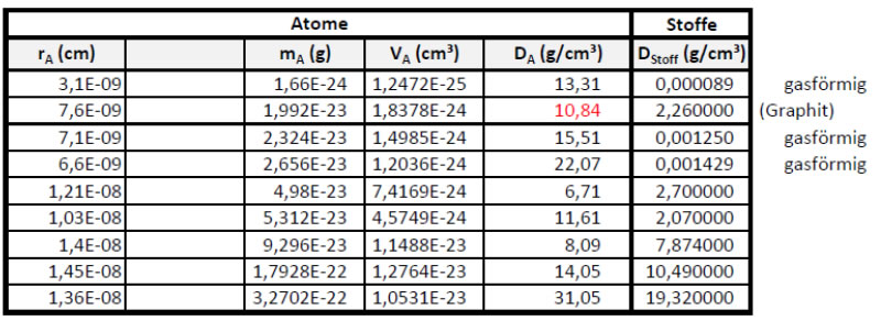 Welches Element in der Tabelle hat die Atome mit der größten Dichte?
