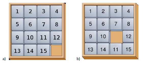 Bevor wir das klären, sollst du selbst versuchen, Gesetzmäßigkeiten zu entdecken. Wir wählen dazu gedanklich ein sogenanntes Schiebepuzzle. Es besteht aus einzelnen quadratischen Plättchen mit Zahlen, die auf einer Unterlage liegen, mit Nut und Federn beweglich verbunden sind und von einem Rahmen zusammengehalten werden. Von den 16 möglichen Positionen bleibt eine unbesetzt.