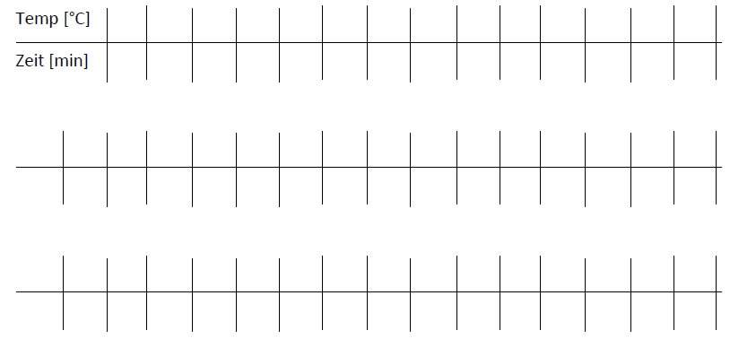Nachdem die Wassertemperatur auf etwa 50°C gestiegen ist, wird das trockene Thermometer in das Reagenzglas gestellt und die Temperatur alle 30 Sekunden abgelesen. Die gemessenen Temperaturen werden in eine Wertetabelle übertragen.