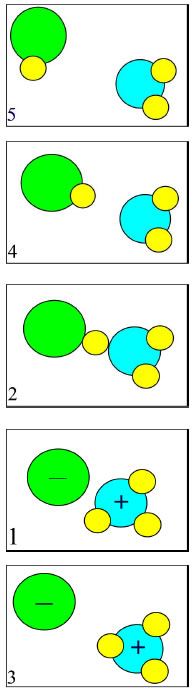 Moleküle treten in Wechselwirkung. Ein Proton wandert zum Chlorwasserstoffmolekül.