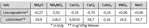 Wähle aus nachfolgender Tabelle je ein Salz, das in Wasser gelöst, die Lösung möglichst stark erwärmt bzw. abkühlt.