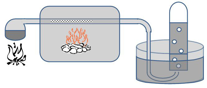 Zur genaueren Untersuchung erhitzte er einen Flintenlauf aus Eisen, in dem sich noch kleine Eisennagelstücke befanden in einem Ofen . Nachdem das Eisenrohr glühte, leitete Lavoisier Wasserdampf durch das Rohr. Das austretende Gas fing er mit Hilfe einer pneumatischen Wanne auf.