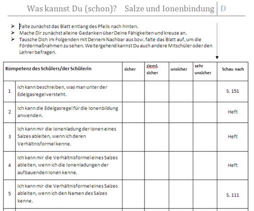 Etwaige Defizite oder Unsicherheiten können dann im Folgenden durch die entsprechenden Fördermaßnahmen bzw. den Austausch mit Mitschülern oder dem Lehrer angegangen werden. Durch das Bearbeiten der anschließenden Aufgaben, die wiederum gezielt bestimmte Kompetenzen ansprechen, können die Schüler im Anschluss selbständig ihre Selbsteinschätzung überprüfen. Ein erneutes Ankreuzen der Kompetenzformulierungen am Ende soll den Kompetenzzuwachs verdeutlichen bzw. immer noch vorhandene Lücken nochmals deutlich machen.