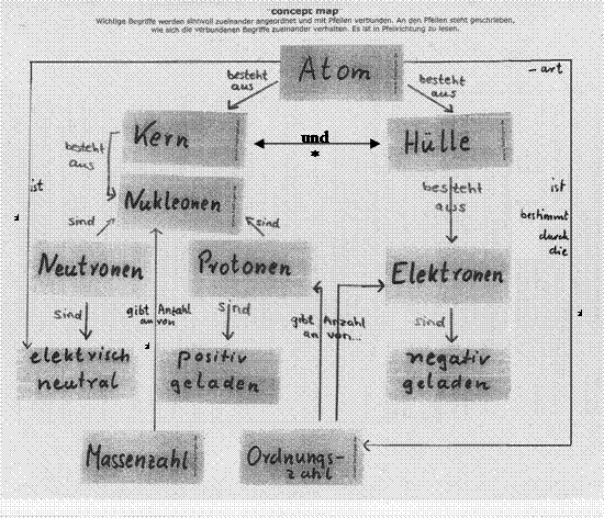 In der Abbildung oben ist eine Concept Map dargestellt, wie sie Schüler mit vom Lehrer vorgegebenen Begriffen erarbeitet haben. Schreibt man die Begriffe auf Post-it Zettel, so lassen sich diese während der Strukturfindung variabel setzen. Damit ist es leichter möglich auch eine ansprechende Darstellung, die auch Symmetrien beachtet, zu erhalten.