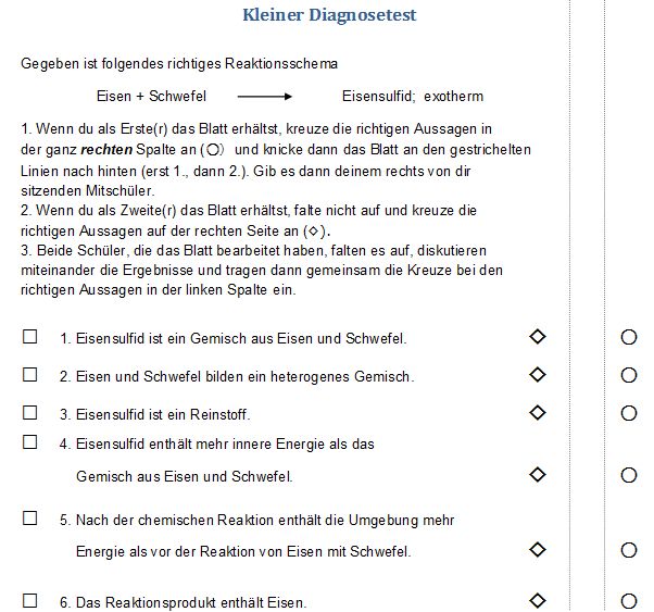 lbst kommen könnten, aufgeführt. Auch richtige Aussagen sind dabei. Zum Thema Chemische Reaktion könnten das z. B. die folgenden Aussagen sein: