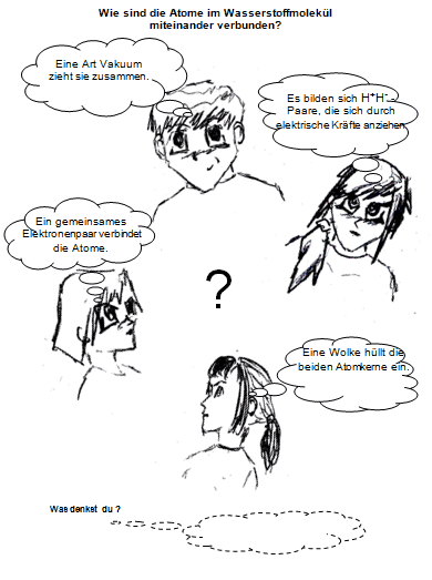 Die Idee des „gemeinsamen“ Elektronenpaars ist möglicherweise im Unterricht noch nicht so präsent wie die Ionenbindung. Deshalb wird als nicht korrekte Antwort das Ionenpaar angeboten. Die nicht spezifizierte „Wolke“ oder das „Vakuum“ soll die Schüler dazu bringen, ihre Vorstellungen auch dann in Worte zu fassen, wenn sie merkwürdig sind und sicher nicht der Erwartung des Lehrers entsprechen. Nur so kann offen über die Qualität der Idee und Möglichkeiten zur Begründung einer tragfähigeren Vorstellung gesprochen werden.