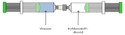 Fülle 30 ml Wasser und 30 ml Kohlenstoffdioxid jeweils in eine 60 ml Spritze. Verbinde die beiden Spritzen und drücke das Wasser zum Kohlenstoffdioxid. Schüttel die Spritzen und schaue wie sich das Gasvolumen verändert. Übe nun Druck auf die Apparatur aus und schüttle erneut. Lasse den Druck nach und schaue gleich wie sich das Gasvolumen verändert hat.
