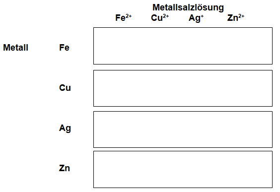 - Ordnen Sie die korrespondierenden Redoxpaare Metallatom/Metall-Kation nach Stärke des Reduktionsmittels bzw. Oxidationsmittels in einer geeigneten Tabelle.