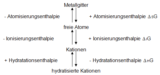 Molare freie Standardenthalpien für Atomisierung Δ A G 0 m , Ionisierung Δ I G 0 m und Hydratation Δ H G 0 m .