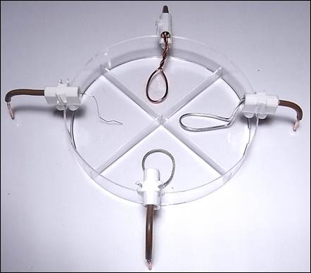 Je nach Verwendung von Metalldraht oder –blechstreifen kann die Petrischale ähnlich dem folgenden Foto aussehen. Dabei ist darauf zu achten, dass sich die Silberhalbzelle gegenüber der Wasserstoffhalbzelle befindet, damit eine Niederschlagsbildung von Silberchlorid im Stromschlüssel vermieden wird.