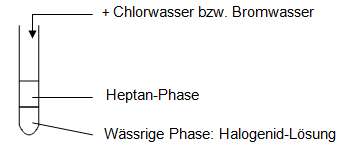Tropfen Sie zu einer Halogenid-Lösung (z.B. Kaliumiodid-Lösung) einige Tropfen Chlorwasser und schütteln Sie nach Überschichtung mit etwas Heptan kurz aus.