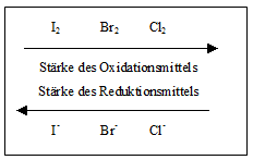 - In einem Lehrbuch findet man folgende Aussage: „Im Labor kann Chlorgas dazu verwendet werden, die Elemente Brom und Iod aus Bromiden und Iodiden darzustellen“. Überprüft diese Aussage mithilfe der Informationen in der Abbildung und formuliert das Ergebnis eurer Überprüfung.