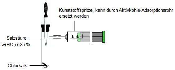 - Zwischen Chlorentnahme und Neutralisation der im Reagenzglas enthaltenen Salzsäure wird die Spritze durch ein Aktivkohle-Adsorptionsrohr ersetzt.