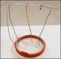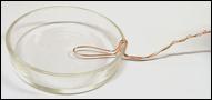 - Biegen Sie ihn dann so, dass er nach einer ca. 3-4 cm langen Schlinge, die später auf dem Petrischalenboden zu liegen kommt, den Rand der Petrischale ungefähr nachformt und darüber hinweg verläuft. Achten Sie dabei aber darauf, dass der Draht nicht zu nahe am Petrischalenrand verläuft, da hier sonst später Lösung aus der Schale gesogen wird.