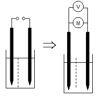 Die Graphitelektroden werden in die Kalilauge getaucht und an den Gleichspannungstrafo angeschlossen. Ein Separator verhindert, dass sich die Elektroden berühren. Für die kurzzeitige (1-2 min) Elektrolyse wird die Spannung so weit erhöht, dass an den Elektroden eine geringe Gasentwicklung erfolgt. Hierbei beladen sich die Graphitstäbe in ihrem feinporigen Gefüge mit den entsprechenden Gasen. Nach der Elektrolyse wird die Spannungsquelle durch ein Voltmeter und einen Mikromotor ersetzt.
